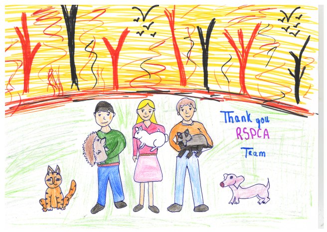 This is what Adham had to say about his creation, “when I first thought about the need to help animals I thought about global environmental issues like deforestation, and then focused on animals in the UK, so my picture shows wildlife whose homes have been destroyed being saved by the RSPCA.”