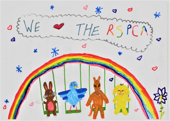 Charlotte was asked to describe her picture and this is what she said, ” it is about lots of different animals in need who have just been rescued by the RSPCA. The swings show that they are being cared for and loved (enjoying playtime) and the rainbow means happier times for them.”